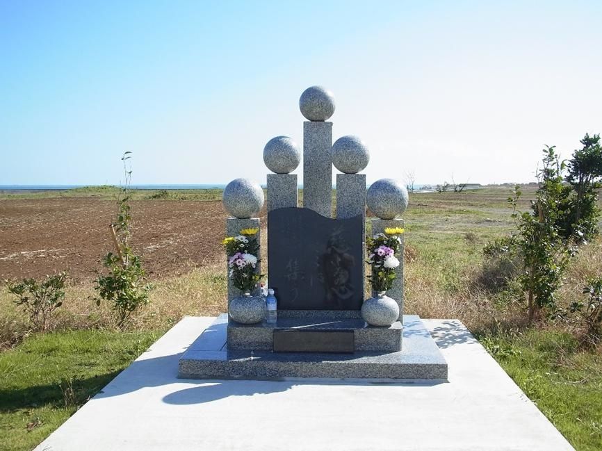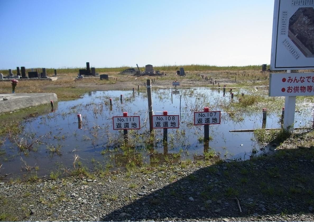 Je suis parti à 9 h 30. Je roulais à vélo le long de la côte, ravagée par l'énorme tsunami, qui avait détruit de nombreuses maisons, et noyé beaucoup d'habitants. J'ai visité le cimetière dans le quartier de Shimoshibusa. J’en avais vu beaucoup dans les villes sinistrées, mais celui-ci est le plus horriblement endommagé. D'après la photo affichée à côté, il était auparavant entouré d'arbres et vert comme un jardin, mais à présent il ressemble à un désert. Beaucoup de pierres tombales ont disparu, si bien que, sur de nombreuses tombes, les cavités dans lesquelles on met les cendres étaient à nu. A certains endroits, il y avait un panneau avec l'inscription « Rendu », ce qui signifie sans doute que le propriétaire de la tombe a renoncé à restaurer la tombe familiale et a rendu sa concession de sépulture.