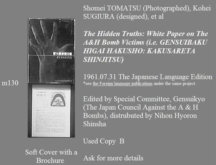 With the co-operation of : Hiroshima City Office Hiroshima A-Bomb Museum, Hiroshima A-Bomb Hospital, Hiroshima A-Bomb Welfare Centre, Chugoku Newspaper Co, Nagasaki International Cultural Hall, Nagasaki A-Bomb Hospital Nagasaki University, Nagasaki A-Bomb Welfare Centre, Nagasaki Newspaper Co. Printing & Bookbinding/Toppan Printing Co Ltd. Printed in Japan28cm x 28cm square format/gravure photo pages 144/ Limited 4000 copies (Russian 2000, English 2000*)/ Price 14 Dollars, 3800 Yen/ Publish Date August 5, 1961/Publisher GENSUIBAKU KINSHI NIHON KYOGIKAI, Shiba Shinbashi 7-12, Mitano-ku, Tokyo-to, JAPAN