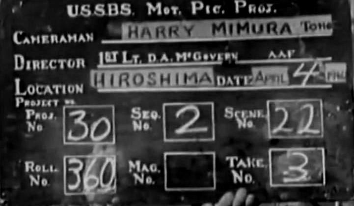 Photogramme tiré du documentaire « Blessures atomiques » de Marc Petitjean, 14ème minute. Où l’on constae qu’en trois mois , depuis janvier 1946, le First Lieutenant McGovern de l’aviation, « director » de ce film a déjà utilisé 360 bobines ! Il doit y avoir quelque part aux Etats-Unis des montagnes de rush.