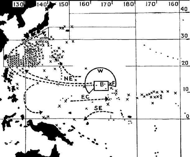 « Carte montrant des points (X) où furent capturés des poissons contaminés et où la contamination radioactive de l’Océan était excessive.