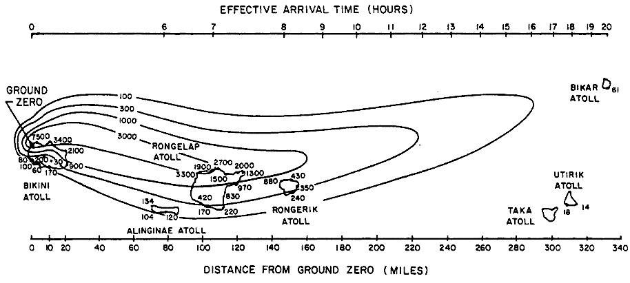 Les retombées de l’explosion réparties niveaux de rayonnement. Les courbes de niveau montrent la dose de rayonnement cumulative en Rœntgens (R) pour les 96 premières heures après le test.